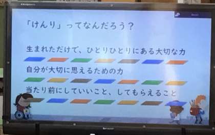 人権は子供にとって理解が難しい内容ですが、当たり前に幸せに暮らす権利について、具体的な生活場面をもとに話し合いました。