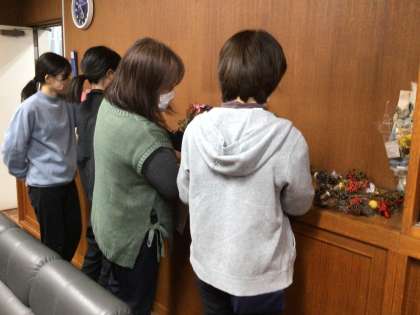 図書館環境整備ボランティア、クローバーの皆さんが、学校の芋のつるで作ってくださったクリスマスリース。各教室に飾らせていただきました。周りがぱっと明るくなります。写真はリースを受け取りに来た担任の先生方。懇談会で、もう見られましたか?ご来校の際は、ぜひご覧ください。