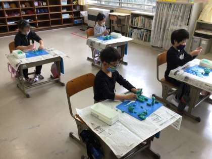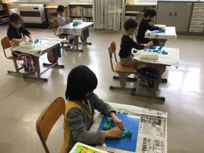 図工で「いっしょにおさんぽ」という題で、自分が連れて散歩したいものを粘土で作りました。