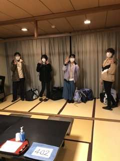 バスから降りて、荷物を持ち、今日の宿、加茂川館に到着です。貴重品を預けて、今から夕食に向かいます。