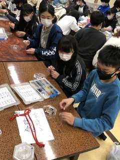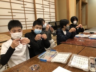 京都の伝統芸術に触れる企画として、幸海小は念珠を作りました。ご利益のありそうな石を選び、一つにまとめます。全種類の石を選んだ子もいました。金運を中心に選んだ子もいました。完成記念で、身につけてポーズ!