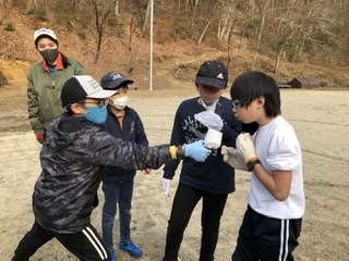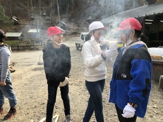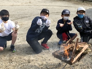 火種をトイレットペーパーに入れて、強く細く、長く、息を吹き込みます。まるで花束をあげてるみたいと次々と交替していきます。煙で苦しそう。でも、みんなやり切りました!おめでとう。