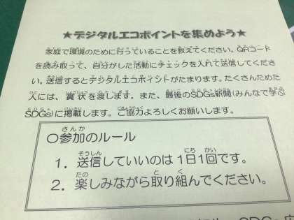 デジタルエコポイントを集めよう と、今日は広報部の2人がチラシを持って、説明に来てくれました。4人目の説明になると、もうベテラン。2人で伝える内容を分担しながら、しっかり説明できました。先生方からは、「すごいね」とほめられて自信をもつことができました。エコポイントをどんどん貯めますね。