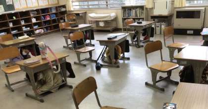 本を借りて教室に戻ろうとした時、避難を知らせる放送がかかりました。どうしたらいいか、迷います。大切なことは、かがんで、すぐに頭を守り、動かないこと。判断して行動できました。ぴりっとした空気の中、先生方は、人数の報告をします。