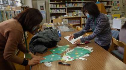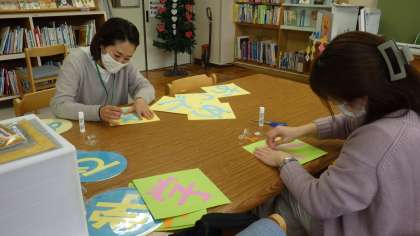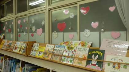 地域学校共働本部 図書館整備ボランティア クローバーさんが、季節の飾りつけに来てくださいました。いつもありがとうございます。とっても素敵!