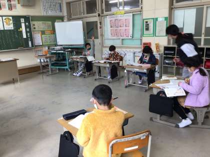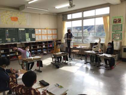 資料を読んだ後の、誰が一番優しいのかなという先生の問いかけに、子供たちは、理由を記入し、発表しました。「グミの実は自分を食べさせたから、優しい」という発言には、まるでアンパンマン、と思わされたり…。