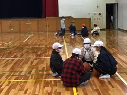 6年生は体育館でチームに分かれて作戦会議をしていました。白熱しているので、自然と大きな声になっていく姿を見て、「相手に知られるよ」と伝えると、途端にひそひそ声になった子供達でした。パスやドリブルを工夫しながら、ゲームをすることができていました。