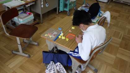 朝の活動で、折り紙を使った立体模型作りをしました。