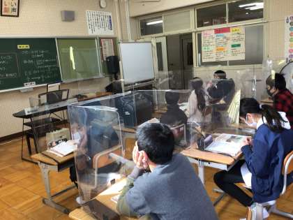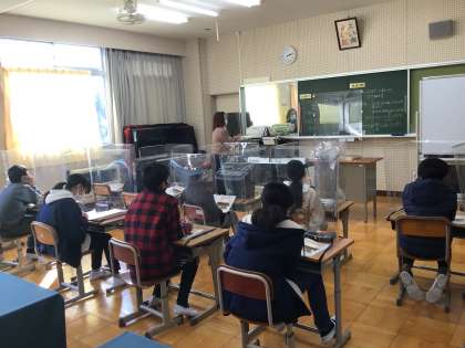 コロナ感染拡大に伴い、校内でもレベル2ないし3の対応で学習を進めています。本校の音楽室では、透明のついたてにより、飛沫拡散防止に努めていますが、学習内容も入れ替えて実施しています。