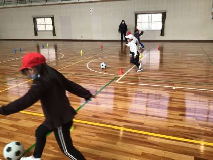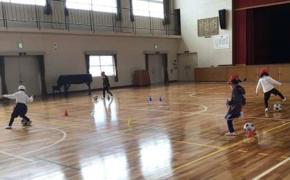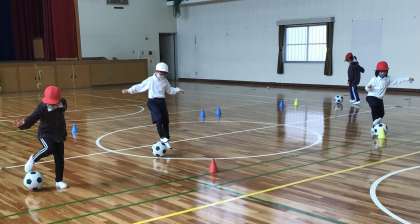 クリアするハードルがどんどん高くなっていきます。先生が全員が到達できたのを見計らって、新しい課題を設定するからです。三角コーンをコースに増やしながら、「次は、間をすうっと抜けるんだよ」「いいね、次は的に当てるんだよ」と説明します。子供達はその度に挑戦を楽しみます。何度も挑戦できるところがいい学びですね。