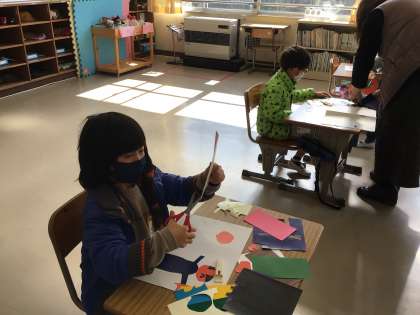 子供達は下書きをもとに、楽しかった思い出を紙版画にしていました。