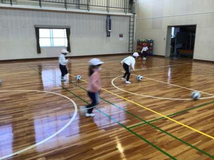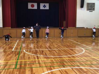 サッカーの授業で、ボールに慣れるために、ボールを使った「だるまさんがころんだ」をしました。