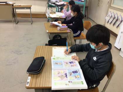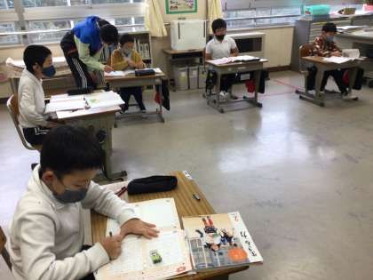 2年生は、一年間の道徳の学習で一番心に残ったお話を選んでいる最中でした。目次を見ながら、一つ一つの学習を思い出す子供達でした。友達の発言をもとに学び合い、新しい自分に出会えた道徳。それぞれ選んだ理由をテキストに書き添えていました。一年間とってもよい話し合いができた皆さんでしたね。