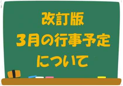 2/17 改訂版 3月の行事予定について 公開日 2022/02/17 更新日 2022/02/17 お知らせ 改訂版の3月の行事予定です。 4月の主な行事も載っています。 下記のリンクをクリックしてください。 3月行事予定(改定)