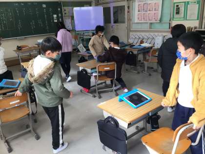 授業の終盤に、教室内を3分間、穴を見つけようと夢中で探し回る子供達。学習タブレットで写真を撮ることで、自分の紹介したい穴をはっきりさせていきました。