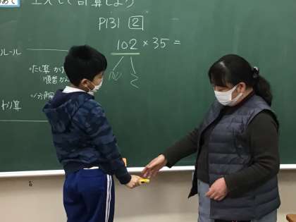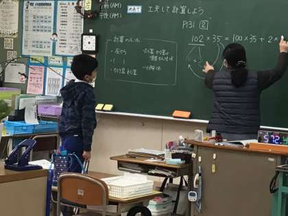 大きな数をかけ算で工夫して計算する方法を考えました。これまでの学習が生きていますね。自分から黒板の前に出て、数を分けることができました。