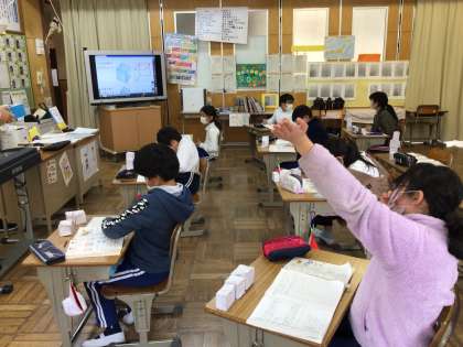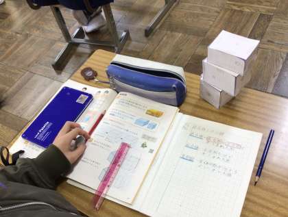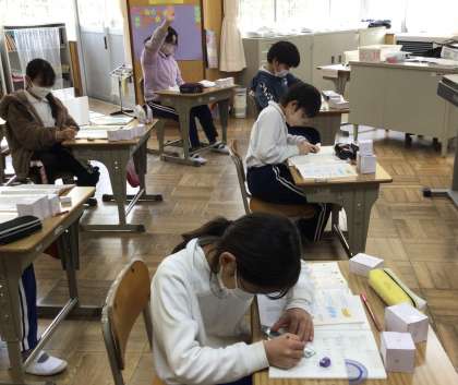 4年生は、展開図や見取り図の学習をしていました。簡単そうに次々と教科書にかくことができていました。教科書の問題ができた人からノートにオリジナルの見取り図もかけましたね。ノートを丁寧に使っている子も多く、感心しました。頑張っているね。