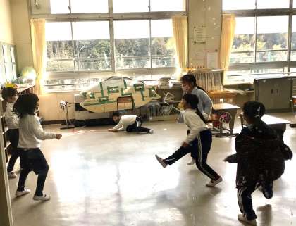 1年生の教室から、楽しそうな笑い声が聞こえてきました。のぞいてみると、体を思いっきり使った、オリジナルダンスの真っ最中でした。花という歌詞に合わせて、手を広げて回転している子もいました。センスあるね。