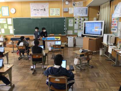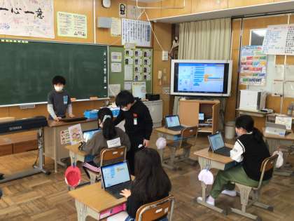 自動運転のプログラミングの研修を児童が講師となって、クラスのみんなに教えました。