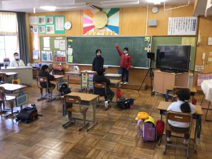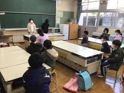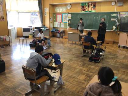 今年度最後の通学団会が行われました。現在、班長の6年生から来年度班長になる5年生への引き継ぎなどが行われました。