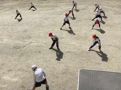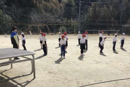 1、2年生は、ちょうど体育の準備運動の最中でした。