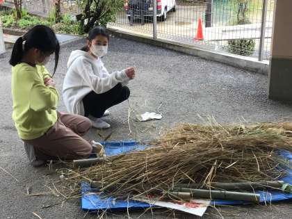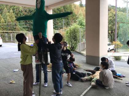 5年生の子供たちが一生懸命に作っていたのは、かかし。ついに、全貌がはっきりしてきました。育てた稲で、キャンプのご飯を炊いて、わらでかかしを作る。愛着が湧きますね。