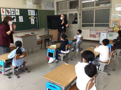 1年生の子供たちも、外国語が大好きなようです。体に関する言葉を歌と動きで復習した後、動物クイズで力試し。パンダの耳を、Panda’s ear とうまく言えました。イラストのパンダが電子黒板に写し出されると、思わず、かわいい〜と声に出す、かわいい子供たち。