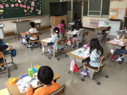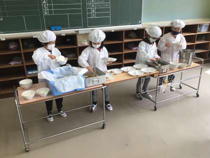 新1年生は、初めての給食でした。2〜6年生は、まん延防止等重点措置が解除され、久しぶりに子供たちが配膳をしました。