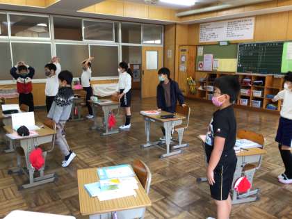 ちょうど詩の勉強の最中で、動作化しながら、言葉のイメージをつかんでいるところでした。プルプルって、どんな動きかな、大きいのかな、小さいのかなという先生からのお尋ねに、もう一度考え直す3年生の子供たちでした。