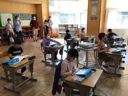 3年生の子供たちは、学校の周りの様子を調べて、マップ作りをする勉強をしました。スカイメニューでそれぞれの情報を交流した後、グーグルマップのスカイビューで、実際の映像を確認しました。学習タブレットの活用が楽しいですね。
