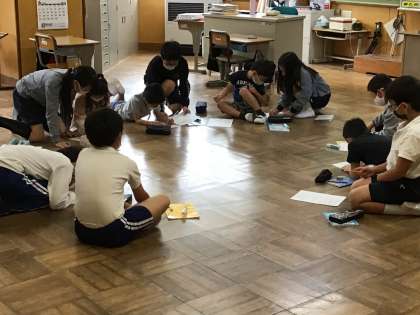 話し合いの司会はすべて6年生。春のふるさとウオークの持ち物や遊びを確認するのですが、一つ話すごとに、「いいですか?」「書けましたか?」と小さい子の様子を確かめながら、進めているのです。異学年活動だからこその、言葉かけです。6年生以外の子供たちからも、低学年をいたわる声かけがありました。どの教室も優しさがあふれた、わくファミ活動でした。心からの拍手です。