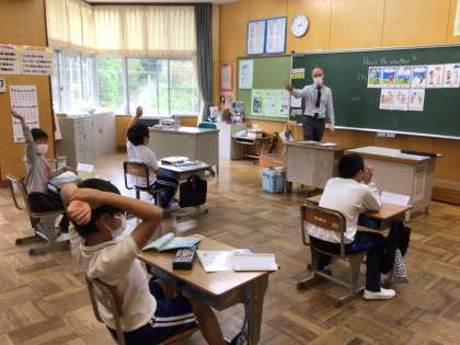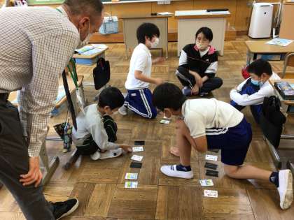 6時間目。少し疲れ気味の子供達でしたが、天気のたずね方、How is the weather?it's cloudy.を使ったカードゲームでがぜん張り切り出す子供達でした。たくさんはなすことができました。