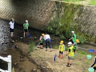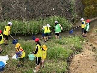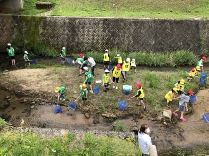 早速、サンダルにはきかえ、川に降ります。雨の影響もなく、2年ぶりの川遊びになりました。たもを持って、生き物探しに夢中の子供たち。どうもサワガニが獲れたようです。