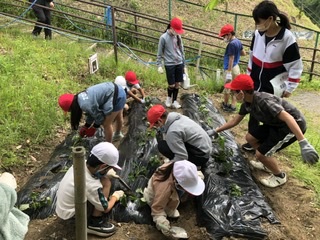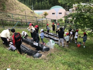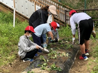 みんなが植えたあと、講師のお二人と教務主任さんとで、飛び出ていた苗を少々手直ししました。小雨の降る中、最後までありがとうございました。たくさん芋ができますように!しばらくは水やりはなくてもよさそうですね。
