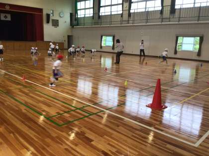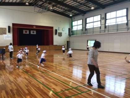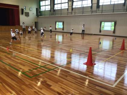 体育館で、リレーや鬼ごっこをして体を動かしました。