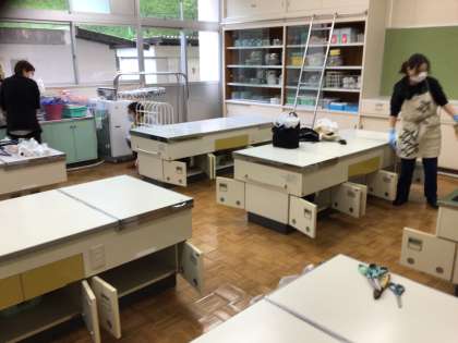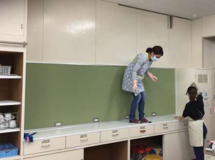 3日目の今日は、掲示物を外し、壁の拭き掃除をしてくださいました。何気にテーブルの下の扉を開けたことから、これは・・・ということに。身をかがめての拭き掃除となりました。おかげで業者さんの整備が入ったかのような美しさになりました。子供たちや先生方が入れ替わり顔を出してはお礼を言って行きました。本当にありがとうございました。お疲れ様でした。