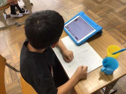 給食と歯磨きの間の時間を使って、タブレットで自学ノートに調べたことをまとめています。