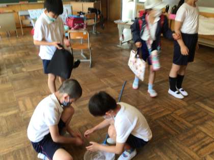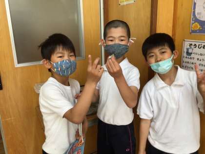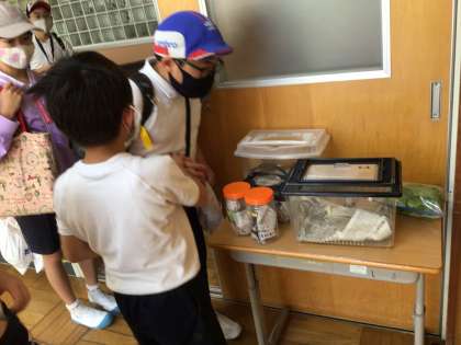 今朝、登校後、教室の方に歩いて行くと、3年生のみんなが大興奮で教室に呼び寄せてきます。なんと、運動場のトイレの裏で見つけたモンシロチョウのサナギが成虫に変身したのです。2匹のチョウになっていました。「これは色が変わったからもうすぐ」と教えてくれるあたり、さすが、虫好き学年3年生です。
