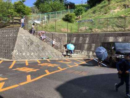 傘さしで間隔をとりながら、マスクを外しての登下校を奨励しています。