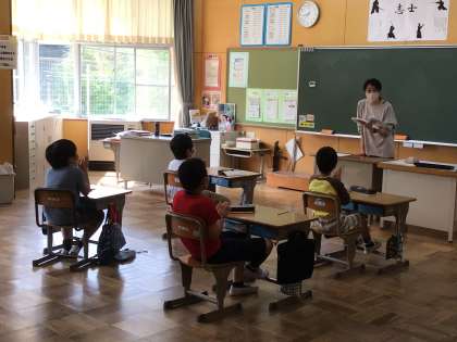 4年生はコグトレを使って、言葉を正しく聞き取るためのウオーミングアップの最中でした。先生の話を注意深く聞き、色を表す言葉が出てきたら、手をポンとたたきます。盛り上がっていましたね。