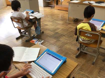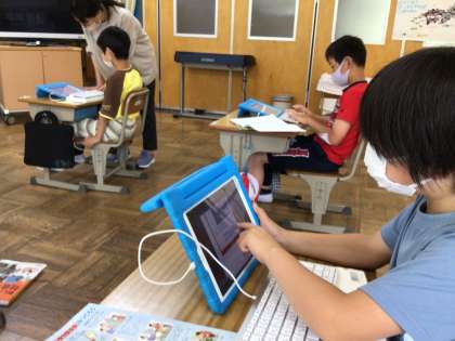 4年生の子供たちは、学習タブレットを使って、愛知県の市町村について思い思いの新聞づくりをしました。それぞれが事前に調べた市の特色をうまく生かして構成します。資料として写真を入れたい子は、スクショ、トリミング機能を使って、効果的に取り込むことができました。作品の出来に満足気な子供たちでした。