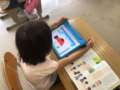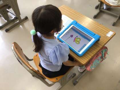 国語でクイズを考えて、クイズの答えをタブレットのお絵かきアプリを使って、絵で描きました。