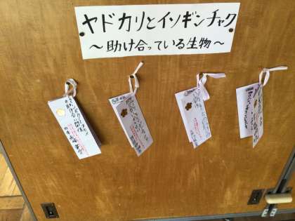 教室の入り口のコーナーには、「ヤドカリとイソギンチャク」の学習を生かした調べ学習の成果が見られます。