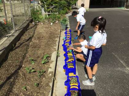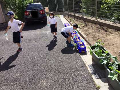 朝一番の気がかりは、ヒマワリやアサガオの水やりです。子供たちはランドセルを片付けると、すぐテラスに飛び出してきます。走って5回以上も水やりをする子もいました。話しかけながら水やりをする子もいました。毎日そんなにやってるの?と尋ねると、雨でぬれている日以外はやるよと、返事。教室で学んだそうです。