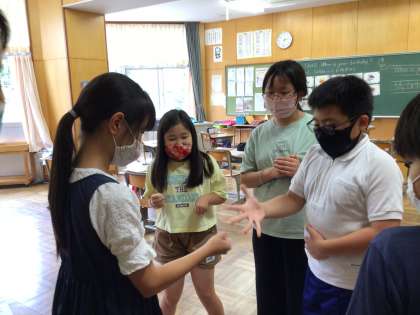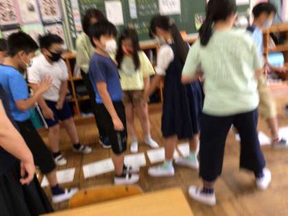 5年生の教室から大盛り上がりの声が聞こえてきます。外国語で日にちを表す言葉を言わなければ、先に進めないゲームをしていました。November 13と、言わなければいけないし、ジャンケンに勝って相手ゴールまで進まなくてはいけないし...ということで、自然に英語表現が身についたかな。