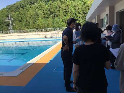 子供たちの下校後、職員会議を終えてから、朝と帰りのプールの準備について説明会を行いました。先生たちにとっても久しぶりの手順。いろんなシュミレーションを想定して、安全に水泳ができるように計画的に研修をしています。