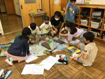 今日は、ICTの動画でちょうについて調べた後、校内で見つけた昆虫のすみかを作りました。それぞれの意見を出し合う姿、とっても楽しそう。ミヤマクワガタにはさまれた子もいましたね。