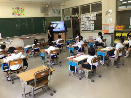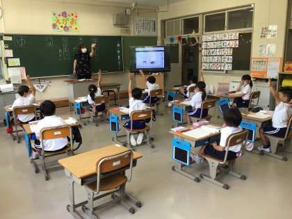 担任の先生がデジタル教科書の挿し絵を示しながら、使い方を確かめました。