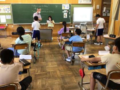 5年生の教室に行くと、ビンゴにしてはいけないビンゴの最中でした。誕生日でカードを作って、月と日にちの言い方を伝え合います。あくまでもビンゴになってはいけないので、複雑な喜び方で、ゲームが進みます。最後に残った一人に拍手!