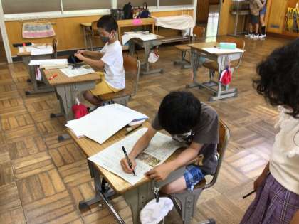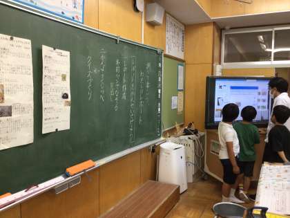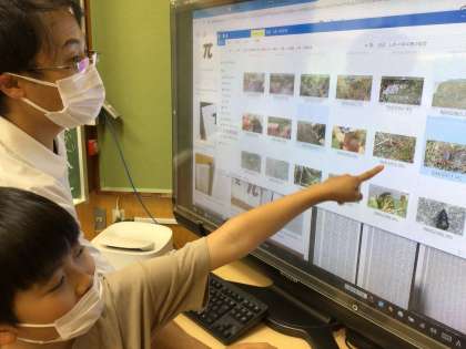 理科の時間に校内で見つけた生き物を学習タブレットで写真に撮った子供たち。カナヘビ、カワニナ、カエルなど、さすが生き物大好き3年生、よく知っています。